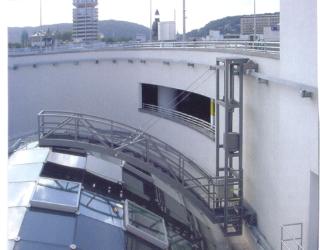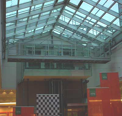 La struttura poligonale dell'impalcatura, lunga ca. 20 m, in alluminio resistente alla corrosione, è stata adeguata alla geometria del tetto in vetro. Su richiesta del committente, è stato adottato un sistema a tubi in alluminio come guida. Lo spostamento del sistema avviene per trazione meccanica da azionare manualmente. Per evitare movimenti oscillanti a causa del vento sono stati previsti dei freni a forcella sui carrelli. In posizione di parcheggio l'impalcatura di pulitura è saldamente ancorata al sistema di guida. In questo edificio sono stati montati 4 sistemi di struttura identica.